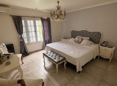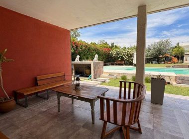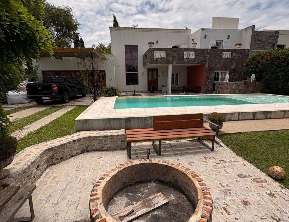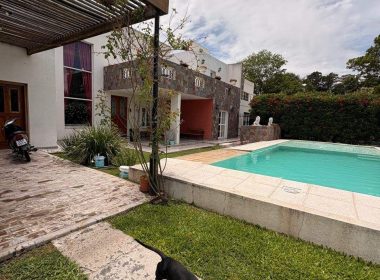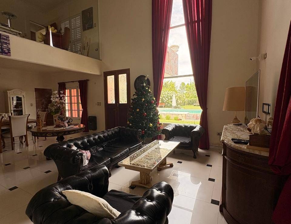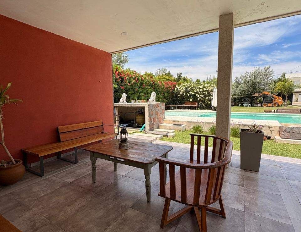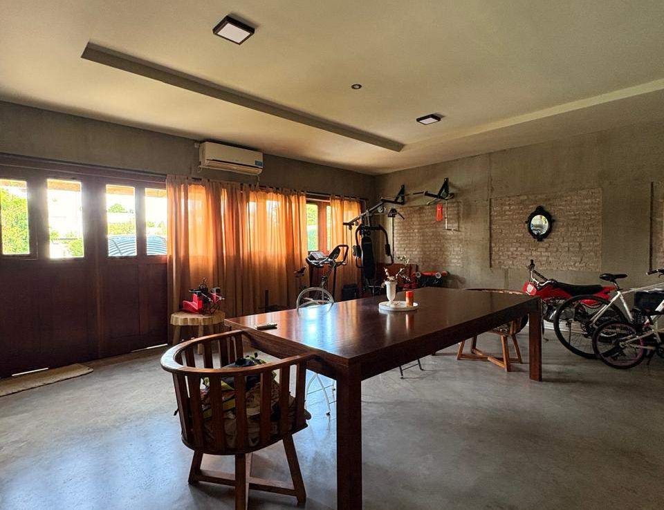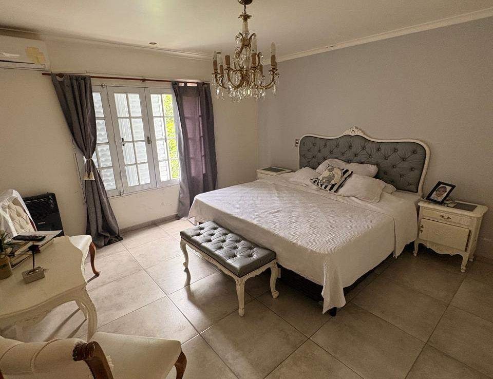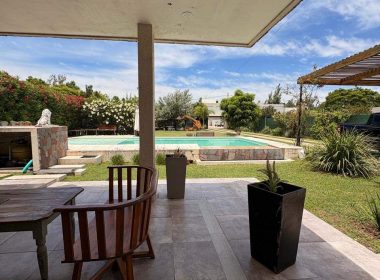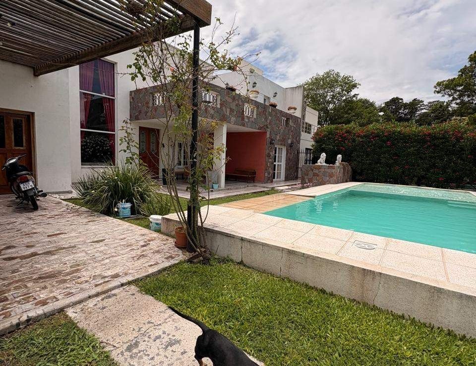 El exterior de la casa es un verdadero oasis, con un hermoso jardín que rodea la piscina, creando el espacio perfecto para el esparcimiento y la diversión en familia. Además, la propiedad está equipada con aire acondicionado, agua corriente y posee un portón automático para mayor seguridad. Los espacios de estacionamiento son amplios, con capacidad para 2 vehículos en cocheras semicubiertas y estacionamiento para visitantes. La dependencia de servicio, el lavadero y la parrilla complementan la funcionalidad de este hogar, ofreciendo todo lo necesario para una vida plena y confortable.