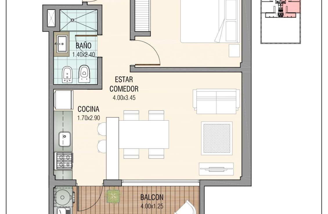 El departamento se compone de 2 ambientes bien distribuidos, que incluyen un dormitorio y un baño, ideal para personas solas o parejas. Además, la propiedad está equipada con servicios esenciales como agua corriente, gas natural, luz, WiFi y cable TV, garantizando un estilo de vida moderno y conectado. La infraestructura de pavimento asegura un acceso cómodo y seguro a la propiedad.